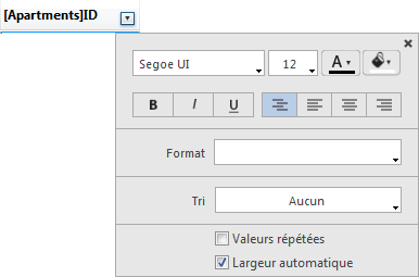 Ce fonctionnement est activé pour une colonne lorsque l’attribut Largeur automatique lui est associé. Vous pouvez définir et visualiser l’activation de cette option dans la fenêtre contextuelle associée à la colonne :