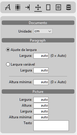 Este painel define as unidades padrão utilizadas para o documento 4D Write Pro e define o tamanho dos parágrafos e das imagens que contém.
