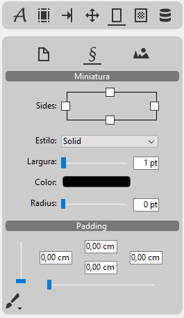 As molduras podem ser definidas para a totalidade do documento ou para os parágrafos individuais, ou para as imagens que são encontradas no texto. Use os icones da parte superior do painel para configurar estes ajustes separadamente para a área desejada: ou seja para o documento,