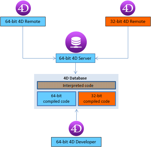 Las aplicaciones 4D destinadas a arquitecturas 64 bits son versiones específicas dedicadas a este entorno; (no funcionarán en sistemas operativos de 32 bits). En el entorno cliente/servidor, toda aplicación remota 4D, 32 bits o 64 bits, macOS o Windows, puede conectarse a una versión de 64 bits de 4D Server mientras que la versión apropiada del código de la base está disponible en el servidor (ver el diagrama abajo).