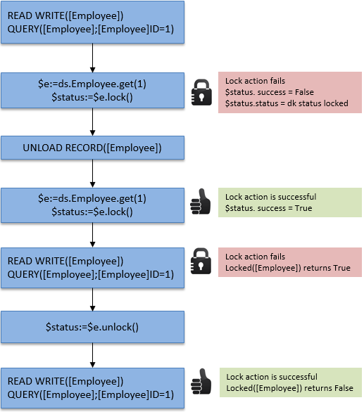- Un bloqueo definido con ORDA en una entidad impide que los comandos 4D classic bloqueen el registro que coincide con la entidad.