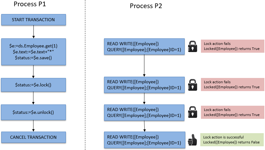 Los bloqueos de transacción también se aplican a los comandos 4D classic y a los métodos ORDA. En una aplicación multiproceso o multiusuario, un bloqueo definido dentro de una transacción en un registro por un comando 4D classic resultará en evitar que cualquier otro proceso bloquee las entidades relacionadas con este registro (o por el contrario), hasta que la transacción sea validada o cancelada.