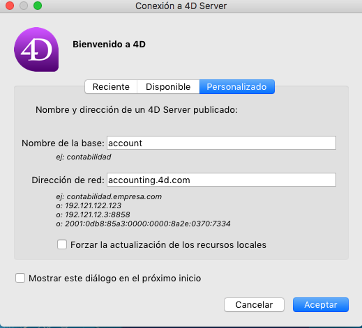 Por defecto, el puerto de publicación de un 4D Server es el 19813, en cuyo caso no es necesario especifica la dirección de red. Sin embargo, especialmente cuando varios servidores se ejecutan simultáneamente en la misma máquina, este puerto puede haber cambiado en las Propiedades de la base (ver la sección Opciones red y cliente-servidor). En este caso, la dirección debe estar seguida por dos puntos y el número del puerto, por ejemplo: 192.168.92.104:19814 (formato IPv4) o [2001:0db8:0000:85a3:0000:0000:ac1f:8001]:19814 (formato IPv6).