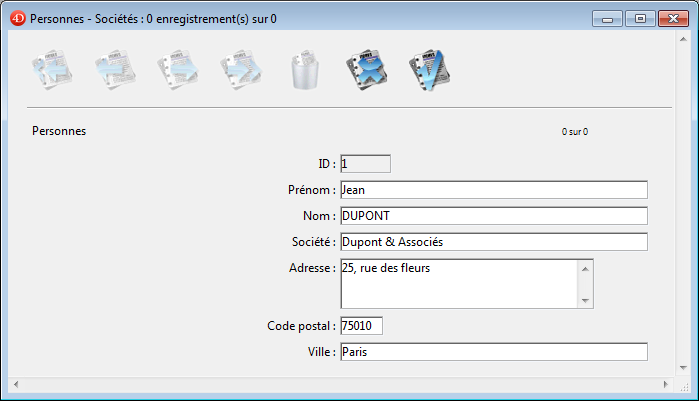 Un autre enregistrement vide s'affiche. L'utilisateur clique sur le bouton Annuler (celui qui comporte une croix) pour terminer la “boucle de saisie des données”. L’utilisateur retourne à l’écran principal.