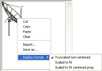In addition to standard editing commands (Cut, Copy, Paste and Clear), the menu also contains the Import... command, which can be used to import a picture stored in a file, as well as the Save as... command, which can be used to save the picture to disk. These two commands take advantage of native picture management: they can be used respectively to open and save pictures in any native format supported by 4D. The menu can also be used to modify the display format of the picture: the Truncated non-centered, Scaled to fit and Scaled to fit centered prop. options are provided. The modification of the display format using this menu is temporary; it is not saved with the record. For more information about picture display formats, please refer to GET LIST ITEM PARAMETER.