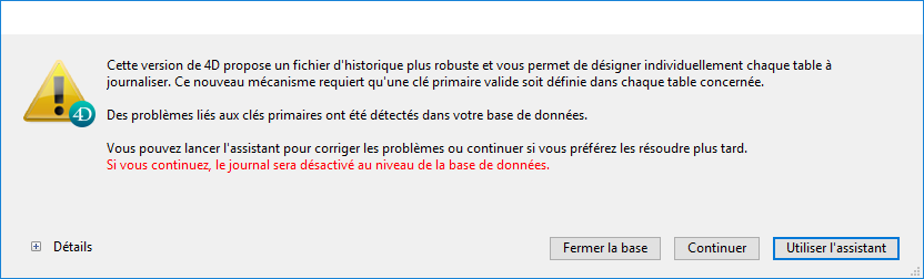 La conversion de bases antérieures à la version 14 dans lesquelles des clés primaires sont manquantes entraîne l’apparition d’une boîte de dialogue d’alerte. Ce point est détaillé dans le paragraphe "Fenêtre d'erreur de clés primaires" ci-dessous.