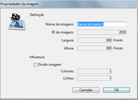 A caixa de diálogo Propriedades da imagem lhe permite definir ou exibir o nome da imagem, dimensões e atributos do marco. Também mostra o número de identificação da imagem (não modificável).