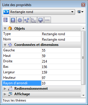 La propriété Rayon d'arrondi est disponible dans le thème "Coordonnées et dimensions" de la Liste des propriétés pour les objets de type Rectangle arrondi :
