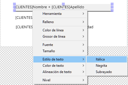 Los campos y el texto insertados en el área se pueden modificar. Para ello, basta con hacer doble clic en el contenido con el fin de cambiar al modo de edición. Particularmente, esto le permite eliminar o modificar elementos concatenados:
