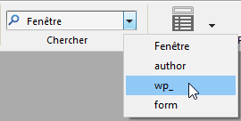 Une fois que vous avez effectué une recherche, la fenêtre de recherche conserve en mémoire la valeur saisie dans la zone de chaîne à rechercher. Cette valeur, ainsi que toutes celles qui ont été saisies lors de la même session en recherche rapide ou en recherche avancée, sont sélectionnables par l’intermédiaire du menu :