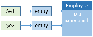 C_OBJECT($e1;$e2) $e1:=ds.Employee.get(1) $e2:=ds.Employee.get(1) $e1.name:="Hammer" //variable $e1 contiene una referencia a una entidad //variable $e2 contiene otra referencia a otra entidad //$e2.name contiene "smith"