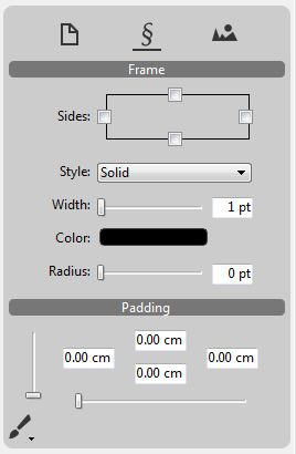 枠線はドキュメント全体に対して、あるいは個別の段落に対して、またはテキスト内のピクチャーに対して設定することができます。パネル上部のアイコンに対して、指定したいエリアでのこれらの対象を設定します。つまり、ドキュメントに対してはボタンを、個別の段落に対しては