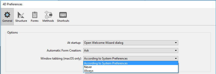 • システム設定に準拠(デフォルト): 4DのウィンドウはmacOSシステム環境設定で定義されているように振る舞います(フルスクリーン時のみ、常に、あるいは手動)。