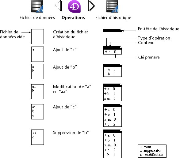 Ainsi, chaque opération effectuée par un utilisateur provoque deux actions simultanées : une première sur les données de la base (l’instruction est exécutée normalement) et une seconde dans le fichier d’historique (la description de l’opération y est enregistrée). Le fichier d’historique se construit de manière indépendante, sans gêner ni ralentir le travail de l’utilisateur. Une base ne peut travailler qu’avec un seul fichier d’historique à la fois. Le fichier d’historique enregistre les types d’opérations suivants :