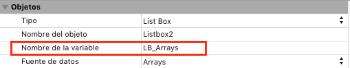 Un array de control de líneas debe ser de tipo Entero largo e incluir el número de líneas que el list box. Para obtener más información, consulte la sección Propiedades específicas de los list box.