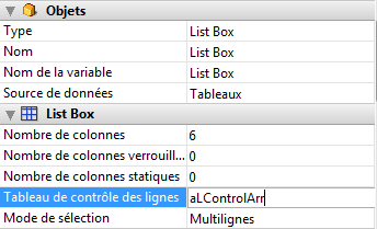 Le tableau de contrôle des lignes doit être de type Entier long et comporter le même nombre de lignes que la list box. Pour plus d'informations, reportez-vous à la section Propriétés spécifiques des List box.