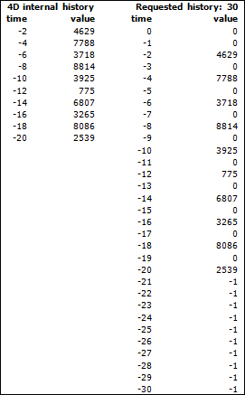 Exemplo: a base só foi iniciada faz 20 segundos e a história da petição é de 60 segundos. Os valores devolvidos entre 0 e -20 se definem com valores ou zeros e os outros se estabelecerão com -1. Quando um valor "-1" se devolve, isto significa que, ou bem o tempo de solicitação é muito antigo ou que o valor já não está no array de história interna (ou seja, chegou ao limite dos 200 elementos e foram eliminados os valores maiores).