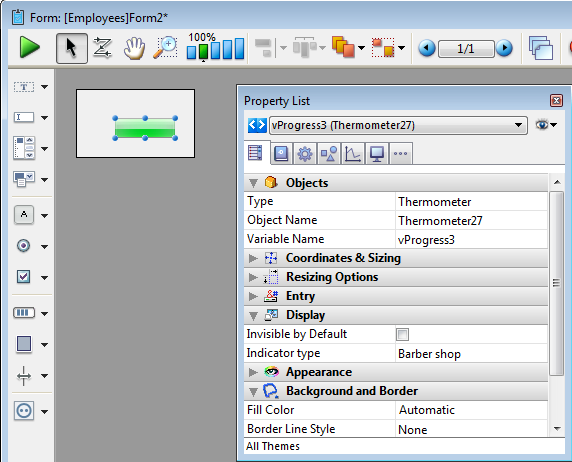 Ajoute une barre de progression verticale associée à une variable numérique (généralement de type Entier long) dont les valeurs min et maxi sont, par défaut, 0 et 100. Vous pouvez modifier ces valeurs en utilisant la Liste des propriétés.