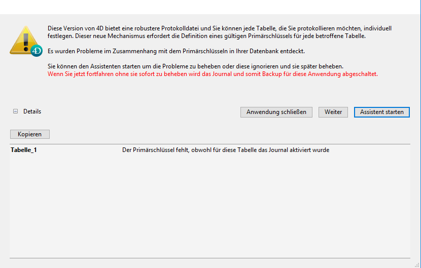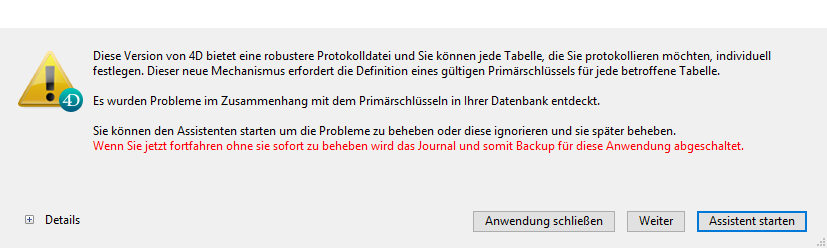 Hinweis: Ist das Backup in der Anwendung nicht aktiviert, bietet der Fehlerdialog die Option, die Anwendung trotz fehlender Primärschlüssel zu öffnen.