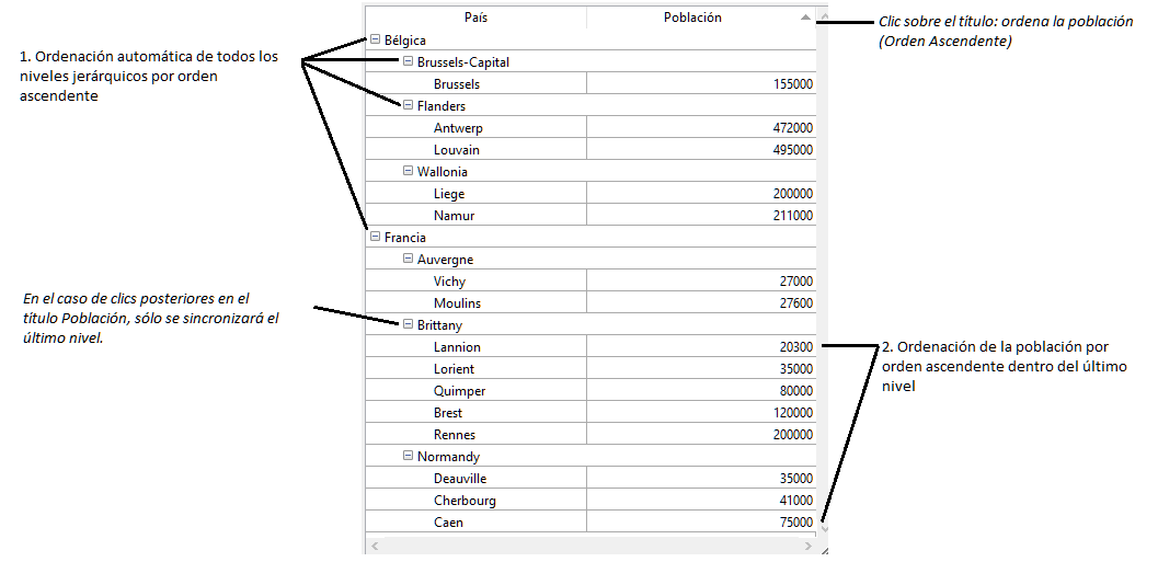 En un list box en modo jerárquico, una ordenación estándar (efectuada haciendo clic en el encabezado de una columna del list box) siempre se construye de la siguiente forma: