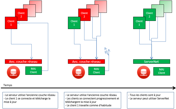 L'ancienne couche réseau est conservée pour assurer la compatibilité des bases existantes. ServerNet est automatiquement utilisé dans les nouvelles bases.