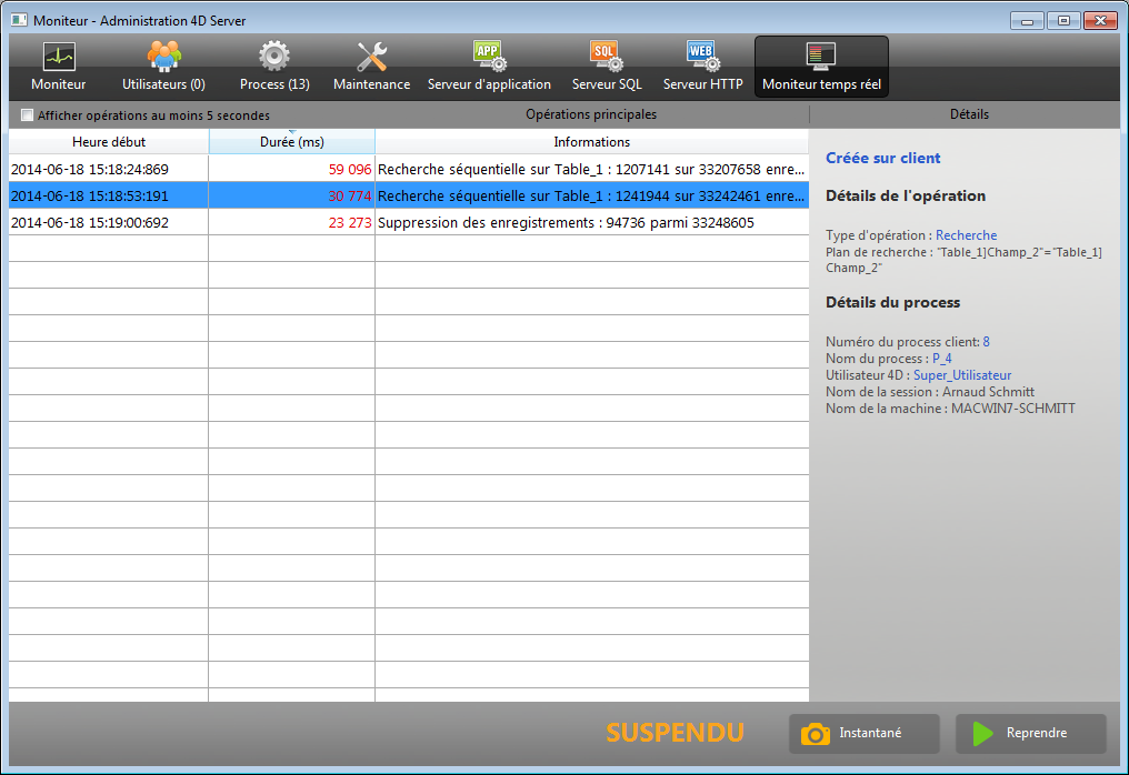 - Créée sur : indique si l'opération résulte d'une action d'un client (Créée sur client) ou si elle a été démarrée explicitement sur le serveur via une procédure stockée ou l'option "Exécuter sur serveur" (Créée sur serveur).