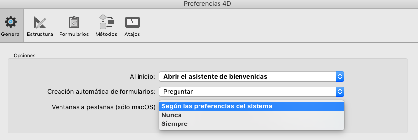 En el diálogo Preferencias de 4D, la opción de Ventanas en pestañas le permite controlar esta funcionalidad: