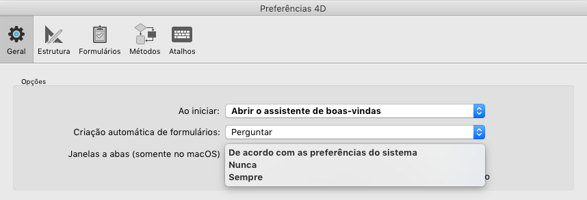 No diálogo Preferências de 4D, a opção de Janelas em abas lhe permite controlar esta funcionalidade: