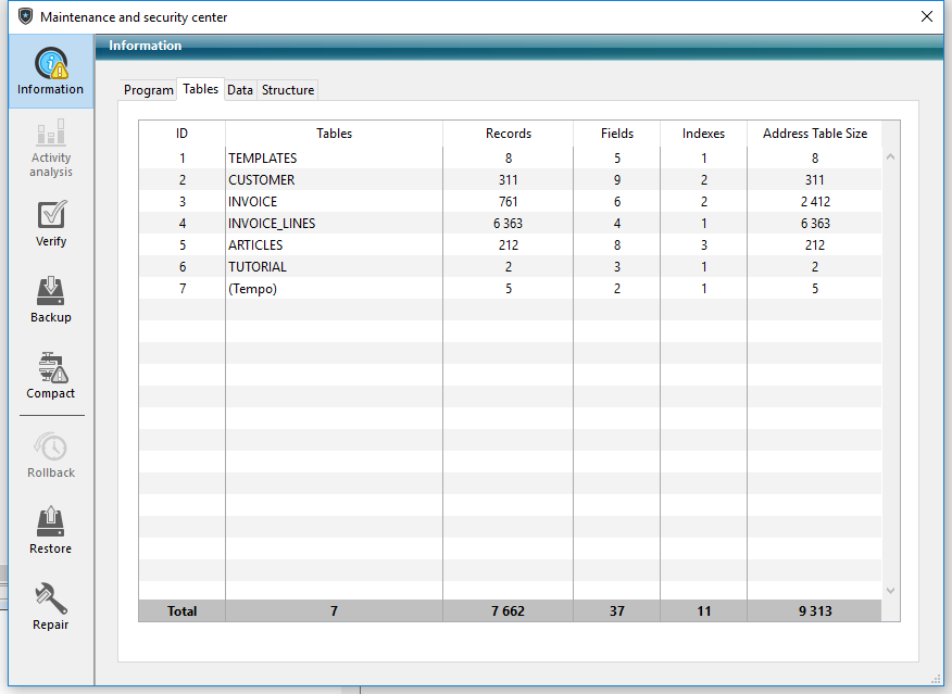 - Registros: número total de registros de la tabla. Si un registro está dañado o no se puede leer, aparece Error en lugar del número. En este caso, puede considerar el uso de las herramientas de verificación y reparación.