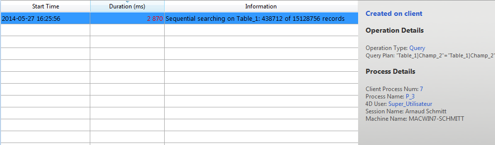 Para acessar ao modo avançado para uma operação, pressione a tecla Maiús e selecione a operação desejada. Toda a informação disponível, será mostrada na área "Detalhes do processo" sem nenhum tipo de filtro (como os devolvidos pelo comando GET ACTIVITY SNAPSHOT). A informação disponível depende da operação selecionada.