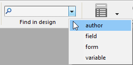 - 含む: デザインモード内で、指定されたテキストをすべて検索します。"var"を検索すると"myvar"、"variable1"、および"aVariable"が検索されます。