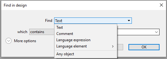 - テキスト: この場合、4Dはデザインモード全体で文字列を探します。