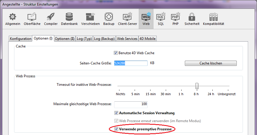 Um den preemptive Modus für Web Server Code Ihrer Anwendung zu aktivieren, müssen Sie in den Datenbank-Eigenschaften auf der Seite "Web/Optionen (I)" die Option Verwende preemptive Prozesse markieren: