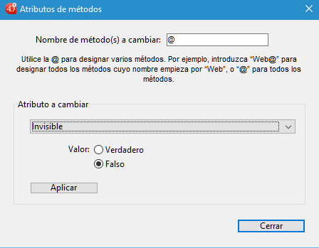 La caja de diálogo "Atributos de los métodos", permite modificar un atributo de método proyecto (Invisible, Ofrecido como servicio web, etc.) para la totalidad o parte de los métodos de la base en una sola operación. Esta función es muy útil para modificar los atributos de un gran número de métodos proyecto. También puede utilizarse durante el desarrollo para aplicar rápidamente atributos comunes a grupos similares de métodos.
