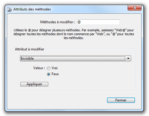 Dans la zone “Attributs à modifier”, choisissez un attribut dans la liste déroulante puis cliquez sur le bouton radio Vrai ou Faux correspondant à la valeur à appliquer. Note : L’attribut “Publié dans WSDL” à Vrai ne sera appliqué qu’aux méthodes projet contenant déjà l’attribut “Offert comme Web Service”.