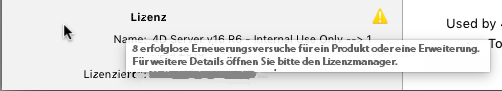 Endet die Produktlizenz oder eine ihrer dazugehörigen Expansions in weniger als 10 Tagen, z.B. bei einer Subscription-Lizenz, versucht 4D Server die Lizenz automatisch über das 4D Benutzerkonto zu erneuern. Schlägt die automatische Erneuerung aus irgendeinem Grund fehl (Verbindungsfehler, ungültiger Account-Status, nicht-verlängerter Vertrag), erscheint neben der Lizenz ein Warn-Icon, um den Server-Administrator darauf aufmerksam zu machen. Ziehen Sie mit der Maus über den Bereich, erscheinen zusätzliche Angaben zum Status der Lizenzerneuerung: