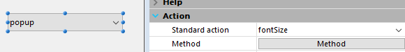 - フォームレベルにおいてポップアップメニュー/ドロップダウンリストに"fontSize" 標準アクションを割り当てます: