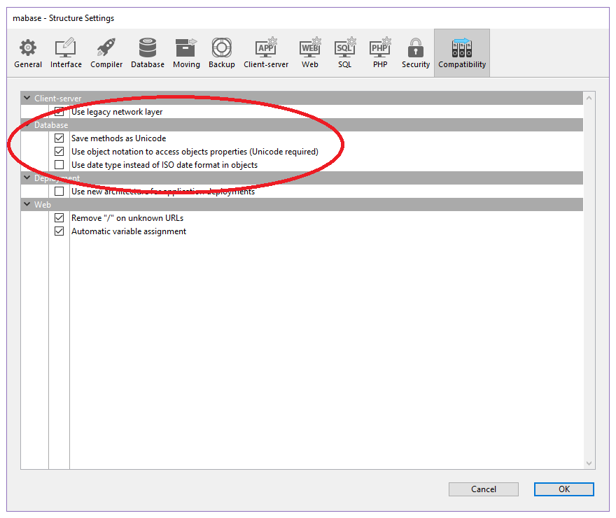 4D v17 以前のバージョンで作成されたデータベースにおいてオブジェクト記法を有効化したい場合、データベース設定ダイアログボックス内の互換性ページにあるオブジェクト記法を使用してオブジェクトプロパティにアクセス(Unicode必須)オプションを選択する必要があります: