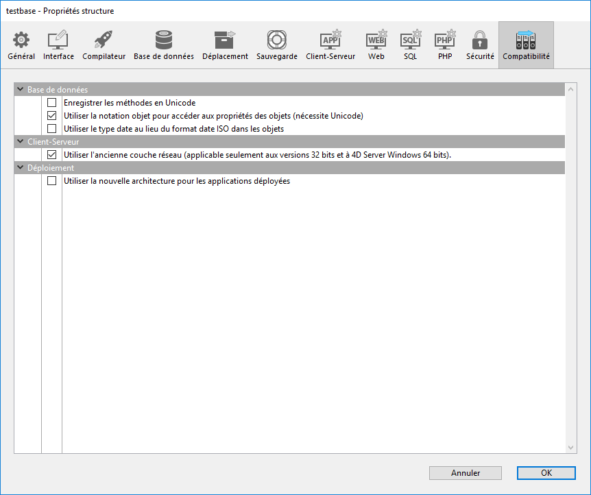 Pour pouvoir utiliser la notation objet dans les bases créées avec une version antérieure à 4D v17, vous devez sélectionner Utiliser la notation objet pour accéder aux propriétés des objets (nécessite Unicode) dans la page Compatibilité de la boîte de dialogue des Propriétés de la base :