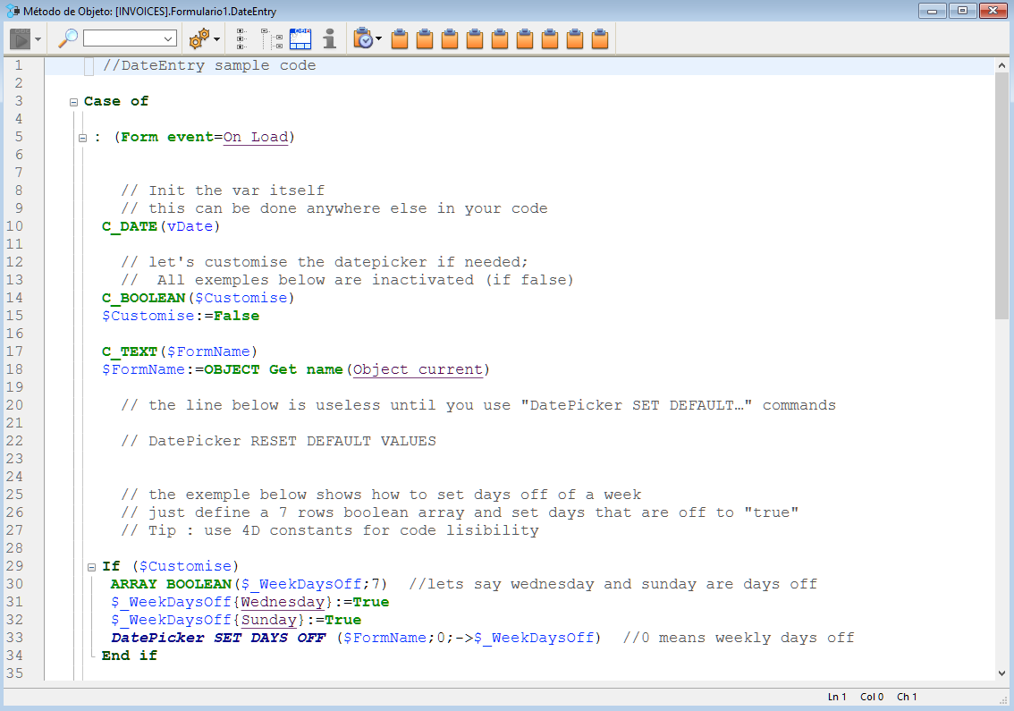 El código de ejemplo se ofrece en su método objeto. Puede configurarlo utilizando los comandos proporcionados por el widget Date picker.