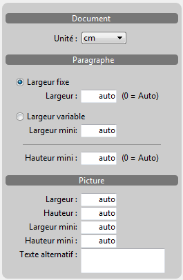 Les paragraphes peuvent avoir une largeur fixe ou variable et les images peuvent être définies avec une taille fixe ou une hauteur/largeur minimum. Lorsqu'une valeur de taille est "auto", elle est basée sur le contenu de l'élément.