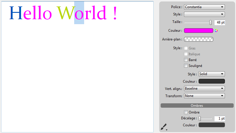Le menu Align. vert. permet de modifier le texte en indice ou en exposant et le menu Transform. permet de choisir parmi différentes combinaisons de casse :