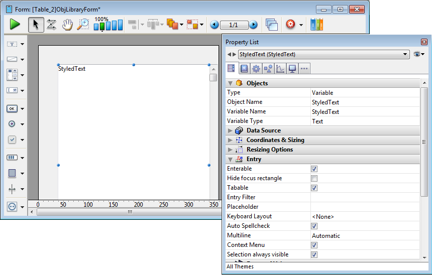 En déposant cet objet sur un formulaire, une zone 4D Write Pro préconfigurée est automatiquement insérée, avec un Widget 4D Write Pro, sous-formulaire contenant les panneaux de contrôle pour gérer le contenu de la zone :