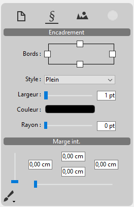 Les encadrements peuvent être définis pour la totalité du document ou pour les paragraphes, ou encore pour les images. Utilisez les icônes dans la partie supérieure du panneau pour désigner le type d'élément à paramétrer, i.e. pour le document,