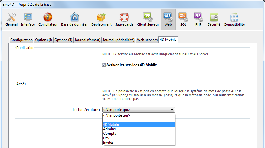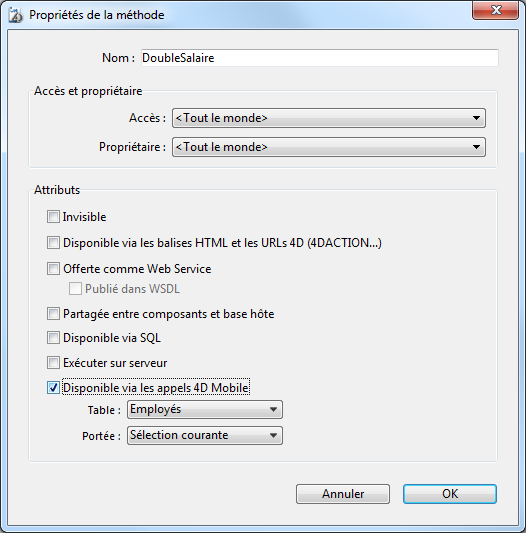 Note : Si un groupe d’accès a été associé à la méthode 4D, vous devez veiller à ce que le groupe 4D Mobile soit inclus dans ce groupe.