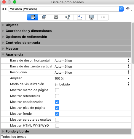 La configuración de vista del documento se manejan a través de temas específicos en el tema Apariencia de la lista de propiedades para objetos de formulario 4D Write Pro: