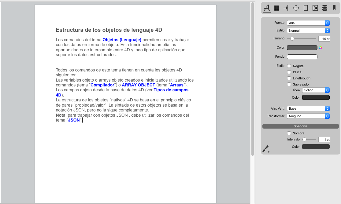 Los documentos 4D Write Pro creados con versiones hasta 4D v15 R5 se muestran utilizando los valores predeterminados para estas propiedades, con la excepción de la propiedad Resolución, que se define en Automático en este caso.