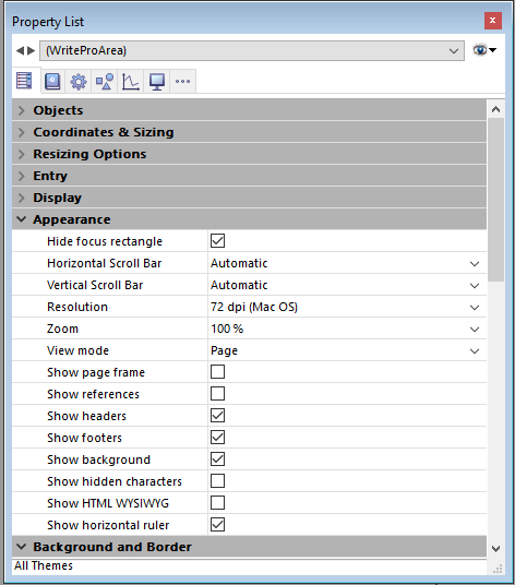 Document view settings are handled through specific items in the Appearance theme of the Property List for 4D Write Pro form objects: