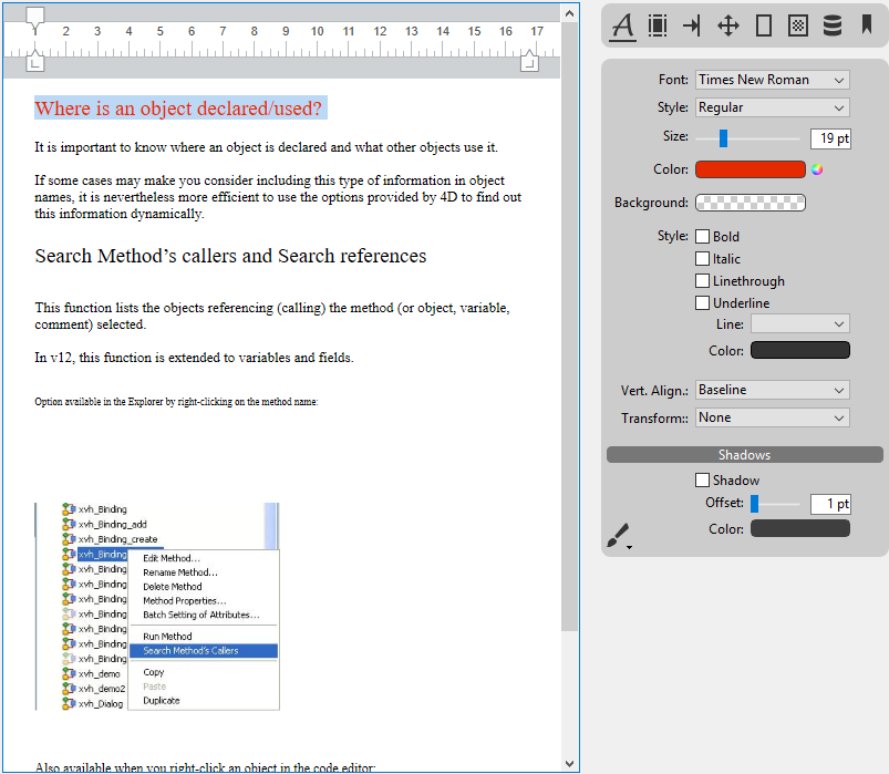 The Variable Name property can be used in the language as a reference to the 4D Write Pro area. Note that the variable must be of the Object type (for more information, refer to the C_OBJECT command).