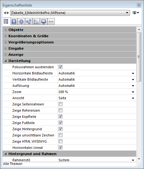 Die Eigenschaften für 4D Write Pro Formularobjekte sind in der Eigenschaftenliste unter der Gruppe Darstellung verfügbar: